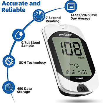 More Clearly Glucose Trend: 4 modes to record your glucose value according to different time, shows your glucose trend more clearly; 450 blood sugar values storage, continuous 14/21/28/60/90 day average, which bring more convenient Diabetes management for you and your health provider