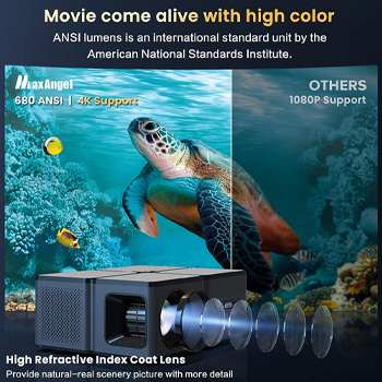 MaxAngel M508A HD home theater projector has an original physical resolution of supports 4K, and with high sharpness & refractive coated glass lenses. Combine with those to make scenes leap off the screen in a deep, bringing movies, shows, and live sports pop in richer, and more lifelike colors.