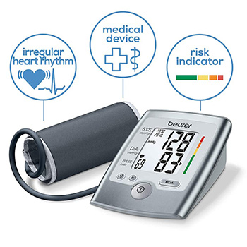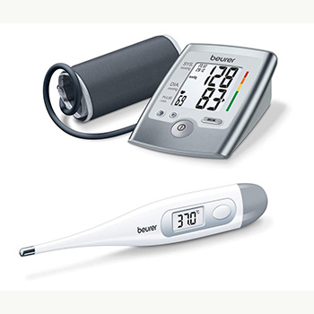 Beurer BM 35 upper arm blood pressure monitor + Beurer FT 09/1 clinical thermometer in white .Country of origin : Germany ,Product dimensions (L x W x H)135 x 105 x 53 mm, Product weight approx. 326 g (with cuff, without batteries).