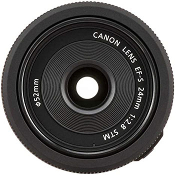 Wide angle lens for Canon APS C cameras (equivalent to 38 millimeter on a full frame camera) Focal length & maximum aperture: 24 millimeter 1:2.8, maximum magnification of x0.27 Slimmest and lightest lens of the EF S series