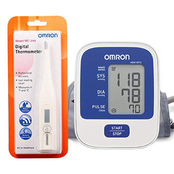 Main unit (Bp Monitor), arm cuff, 4 aa batteries, instructions manual, Omron digital thermometer m-246
