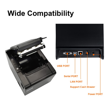 【Fast Printing & Auto Cutter】The pos printer high efficiency with auto cutter and the fastest printing speed--250mm/sec. Easy for paper installation, Easy maintenance, and excellent structure.Plug and play USB PORT, easy to use.Three Interface ports:USB+ LAN + SERIAL PORT.DO NOT-Wifi-Bluetooth.Support WIN2003/WINXP/WIN7/WIN8/WIN10/LINUX/Mac