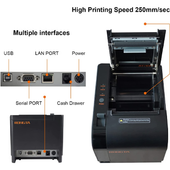 【Auto Cutter】The thermal receipt printer high efficiency with auto cutter and the fastest printing speed--250mm/sec. Easy for paper installation, Easy maintenance, and excellent structure.Plug and play USB PORT, easy to use.Three Interface ports:USB+ LAN + SERIAL PORT.DO NOT-Wifi-Bluetooth.Support WIN2003/WINXP/WIN7/WIN8/WIN10/LINUX/Mac