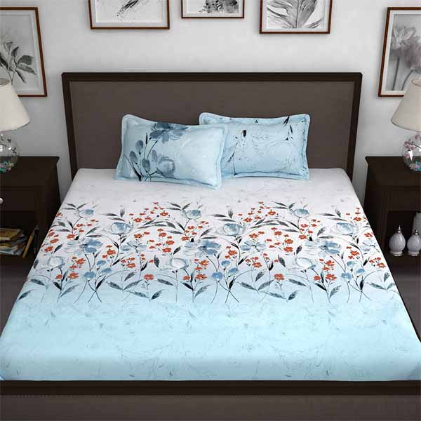 King Material Cotton Colour White and Blue Pattern Floral Brand Story@Home Number of Pieces 3 Special Feature Wrinkle Free, Skin Friendly, Lightweight, Color Fastness, Feel's like Cotton Style Modern Included Components 1 King size Bedsheet with 2 Pillow Cover |