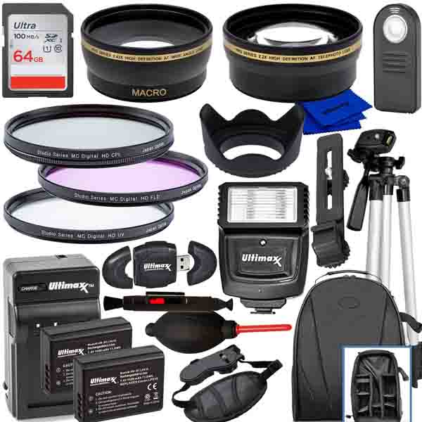 KIT INCLUDES: .43x Wide Angle Macro Lens, 2.2x AF Telephoto Lens, 6PC Gradual Color Filter Kit, 4PC Close Up Lens Kit, 2x LP-E10 Batteries, LP-E10 Travel Charger, 72" Monopod, 72” Tripod, Professional Backpack, Slave Flash, Wrist Strap, Lens Cleaning Pen, Tulip Lens Hood, Memory Card Reader, SanDisk Ultra 32GB Memory Card, and Wireless Remote